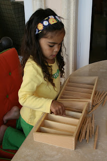 Pumpkin had her turn with the spindle box today. She did very well counting using one-to-one correspondence, but started to loose concentration at numerals 8 and 9. There is a good video showing the method for teaching with the spindle box here.