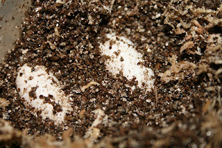 Today, Bear’s gecko Ally, (because she is an Albino leopard gecko) gifted us with two eggs. Unfortunately, she was not the first of our female geckos to lay a pair of eggs. Spotty had that distinction, but due to my Leopard Gecko learning curve, otherwise known as my failure to provide a nesting box in time, she was forced to lay her eggs on the floor of the hide, where it promptly dried up. We saved the poor little shriveled things so that it would not be in vain—but for science! And what can I say? At least I learned a thing or two in the process.